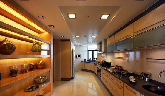與普通戶型相比別墅廚房的面積大、層高(徑向)較高,通常都在3米以上。房主經(jīng)常在這里舉行PARTY等聚會(huì)活動(dòng)。作為一個(gè)社交場(chǎng)所,在設(shè)計(jì)廚房時(shí)充分地利用高度方向上的空間,在滿足了基本的儲(chǔ)物空間、操作空間的前提下,要留有足夠的活動(dòng)空間。此外,要對(duì)廚房空間進(jìn)行分割,一般采用島式或者半島式布置,在島的上方可以設(shè)計(jì)鋁制吊架、實(shí)木系列吊架、玻璃吧臺(tái)等。既可以充分利用空間,又讓使用極為便利。在空間允許的情況下,可以在廚房的一側(cè)設(shè)計(jì)一排筒柜,把冰箱、烤箱、消毒柜、卷簾門全部集中在此,顯得很有氣勢(shì)。