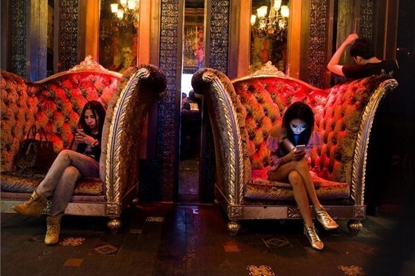 上海,一家夜總會入口處,坐在沙發上等待的女孩們。